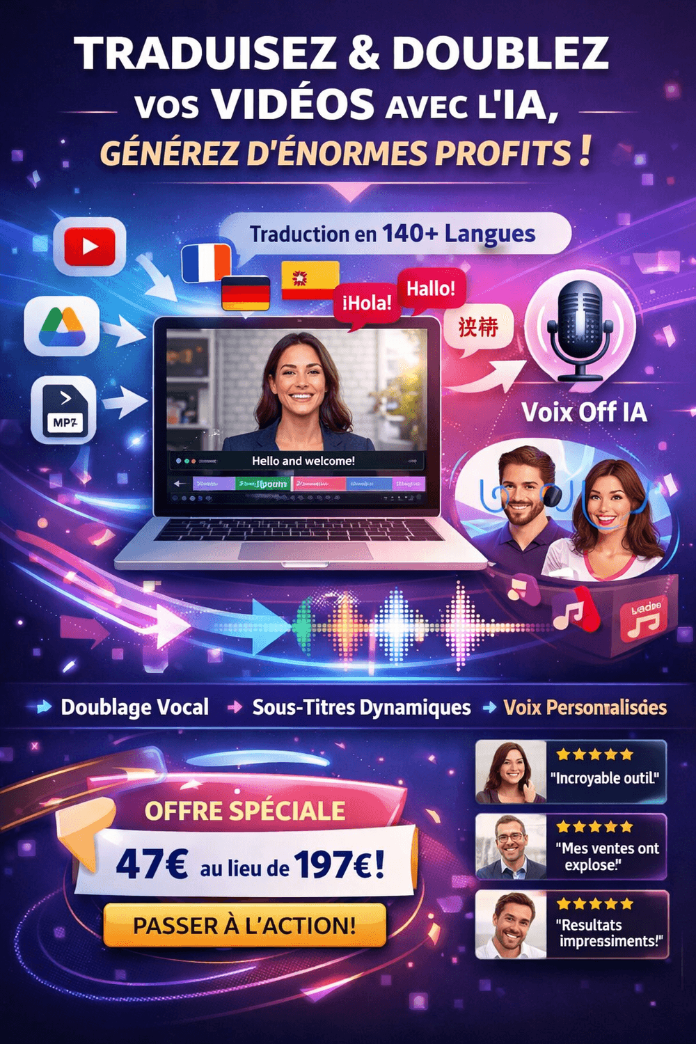 de transformer instantanément n'importe quel texte en une VOIX-OFF impeccable,